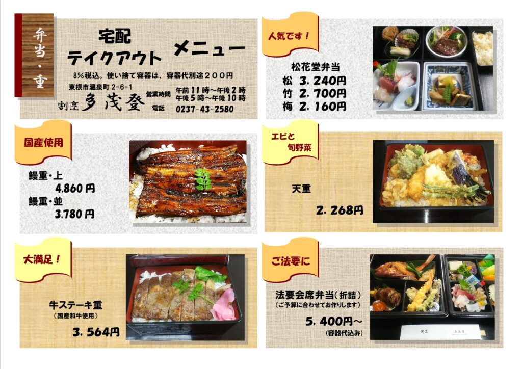 多茂登では、松花堂弁当や鰻重などのテイクアウト・宅配サービスを行っております。当店の味をご自宅で、職場で気軽にお楽しみ下さい。